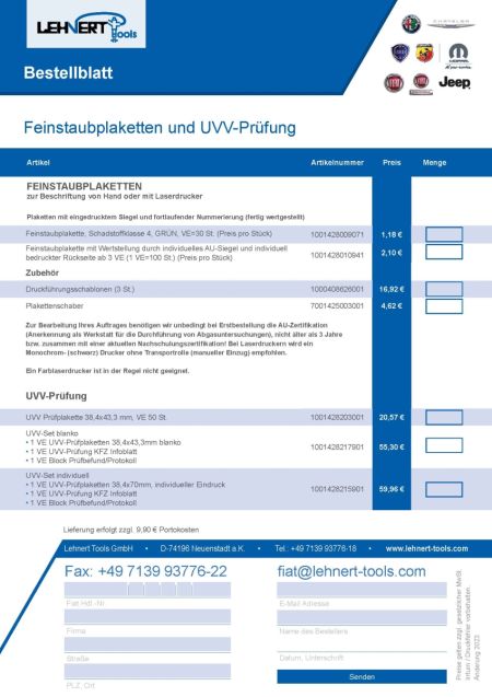 Bestellblatt Feinstaubplaketten und UVV-Prüfung