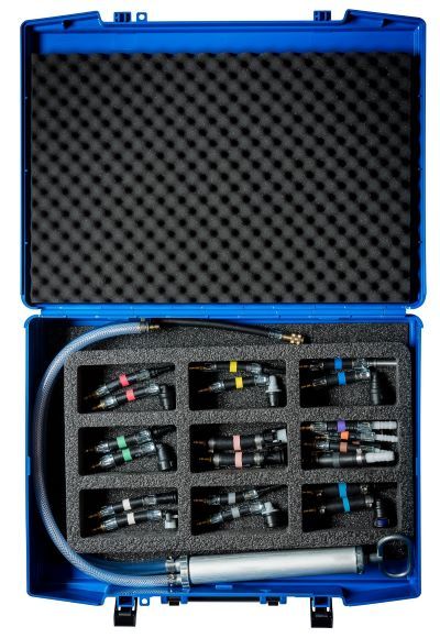 - Schnelle Verbindung des Entlüftungswerkzeugs mit allen gängigen Kraftstoff-Systemen durch enthaltene Adapter